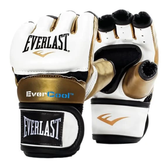 The Everlast Everstrike Training gloves white gold are versatile and ideal for MMA training, plus they allow for an easy transition from cardio workouts to heavy bag training or glove work. They are made of premium synthetic leather and foam padding that dissipates impact shock, keeping your hands and knuckles safe. Reinforced fifth metacarpal padding minimizes hand trauma, and the EverCool ventilation system and EverDri technology keep hands dry during even the most intense workouts.