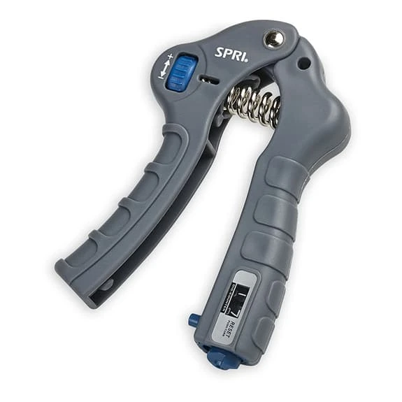 The SPRI Easy Adjust Hand Tensioner improves grip, relieves stress, and increases hand, wrist, and forearm strength. The grip ranges from 9 to 35 kg of resistance and has a built-in counter that records the number of completed grips. The ergonomic design is safe and comfortable, while the molded plastic is ideal for long-term durability.